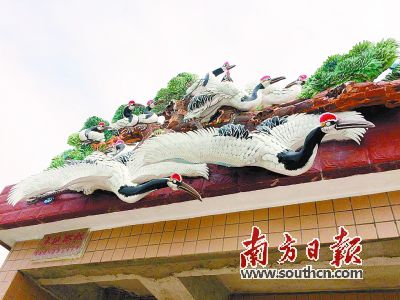 饒平縣黃岡鎮(zhèn)寨上社區(qū),一片水泥房住宅中,有一間民宅屋頂顯得“鶴立雞群”—屋頂真有88只瓷“鶴”棲息在瓷做的松樹(shù)上,這幅圖是屋主蔡炳烈用3000個(gè)瓷