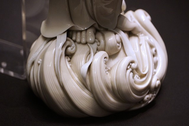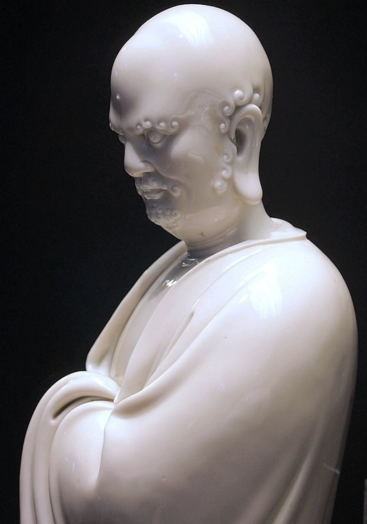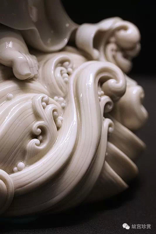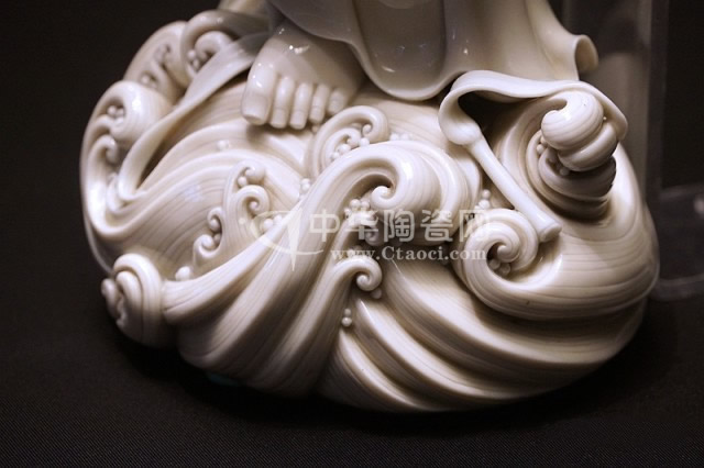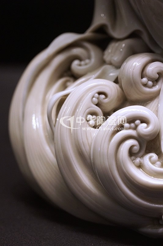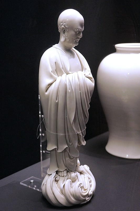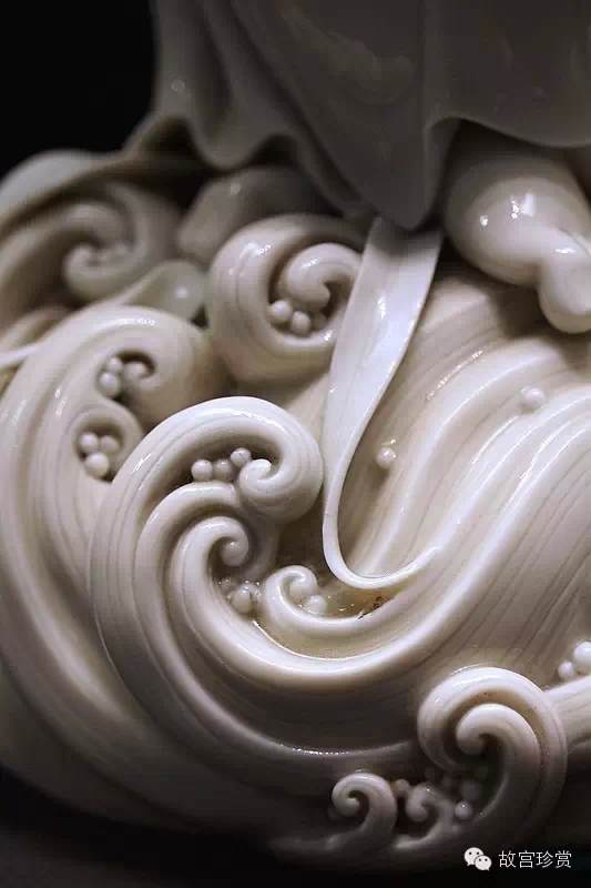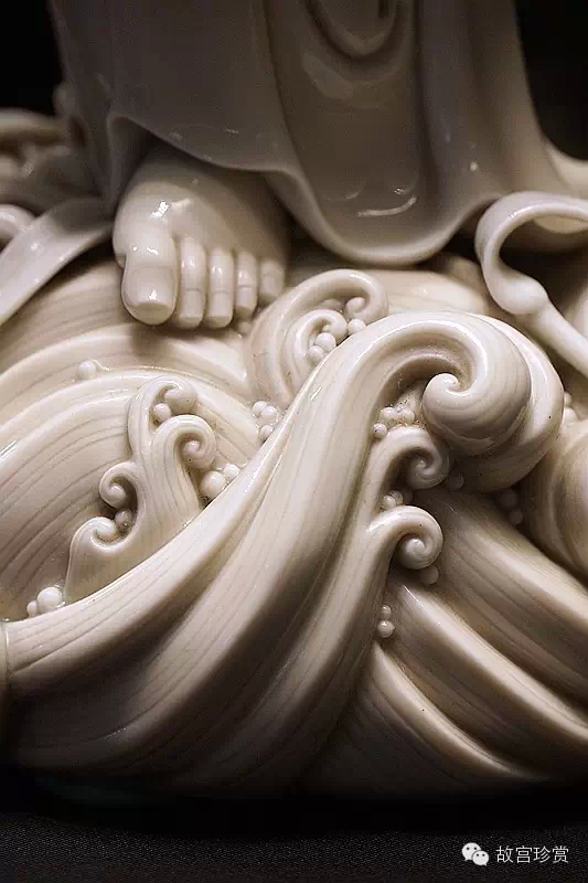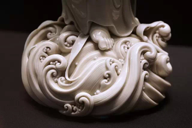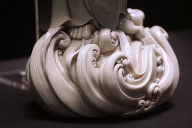 而何朝宗最為精彩的傳世瓷塑名作《達(dá)摩立像》,這件立像與其他德化窯瓷塑人物一樣,體量不大。但卻將波濤之上一葦渡江的達(dá)摩表現(xiàn)得維妙維肖。何朝宗所作此像,在精準(zhǔn)優(yōu)美的人物形象塑造和令人叫絕的衣紋水波再現(xiàn)之外,正所謂——妙不可言。