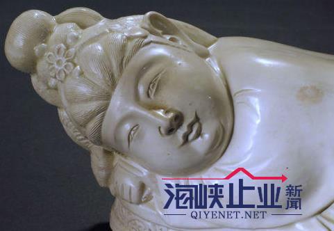 此件定窯美人枕,長43厘米,寬15.5厘米,質(zhì)地細(xì)膩,通體施釉,釉層均勻,僅在衣褶等凹處有積釉現(xiàn)象,但絕無掛釉的缺陷,釉色白潤如玉,光亮可鑒,釉層較厚處,色澤白中透青,工藝精巧,先使用模具燒制成型,再加以精細(xì)的雕工。圖為美人枕局部。
