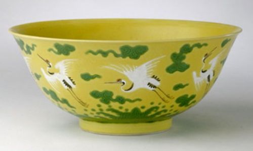 黃地綠海水白鶴紋碗