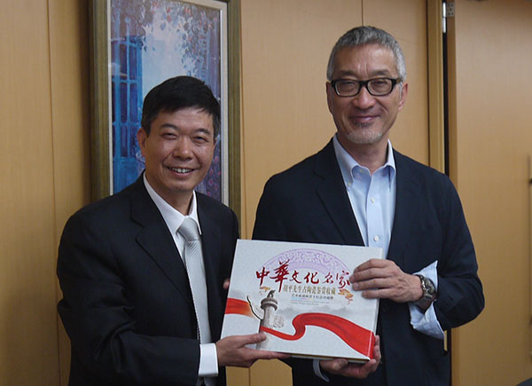 (圖為胡平向日本大阪產(chǎn)業(yè)大學(xué)校長(zhǎng)瀨島順一郎贈(zèng)送紀(jì)念冊(cè))