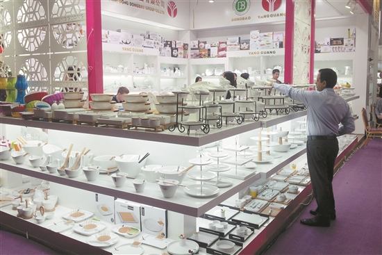 隨著傳統(tǒng)展會效果的弱化,跨境電商異軍突起,成為陶瓷出口的下一個藍海。圖為外商在廣交會上參觀陶瓷展位。(黃荷)