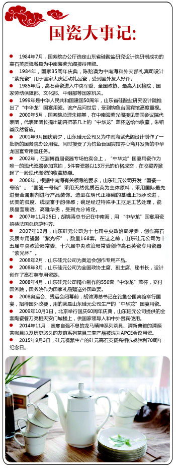 這也是高石英瓷首次進(jìn)入中南海紫光閣,該瓷種制成的瓷器逐漸成為黨和國(guó)家多個(gè)機(jī)關(guān)最高接待用瓷。此后,從國(guó)家領(lǐng)導(dǎo)人出訪的禮品瓷到國(guó)家重大外事活動(dòng)接待用瓷,無不閃耀著硅元瓷器的身影。