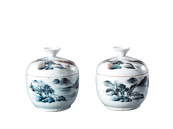 藍(lán)彩山水紋蓋罐