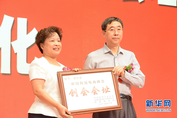 中國(guó)陶瓷工業(yè)協(xié)會(huì)理事長(zhǎng)杜同和向德化縣縣長(zhǎng)歐陽秋虹授予中國(guó)陶瓷電商峰會(huì)創(chuàng)會(huì)會(huì)址紀(jì)念牌
