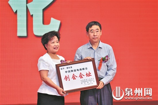 ▲中陶協(xié)理事長(zhǎng)杜同和宣布德化為中國(guó)陶瓷電商峰會(huì)創(chuàng)會(huì)會(huì)址,德化縣長(zhǎng)歐陽(yáng)秋虹接過(guò)創(chuàng)會(huì)會(huì)址牌匾。