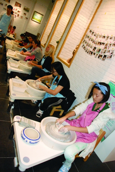 陶藝體驗(yàn)吧是北京陶瓷藝術(shù)館內(nèi)最具特色和吸引力的空間。據(jù)介紹,北京市朝陽區(qū)教委已將該區(qū)部分中小學(xué)的藝術(shù)實(shí)踐課安排于該館,從周一到周五,每天都有幾個(gè)班級(jí)的學(xué)生在此過把“玩泥巴”癮——細(xì)膩滑潤、充滿韌性的泥巴在手中塑形,“手隨泥走,泥隨手變”,逐漸拉坯成型;成型晾干后可以進(jìn)行陶瓷繪畫,隨性而發(fā);陶藝制作完成后,經(jīng)過十幾天的風(fēng)干,再放入專門的電窯進(jìn)行燒制,最終將成品交給體驗(yàn)者。陶藝體驗(yàn)吧提供制瓷教學(xué)、陶土塑形體驗(yàn)、陶瓷繪畫體驗(yàn)、作品展示等服務(wù)。