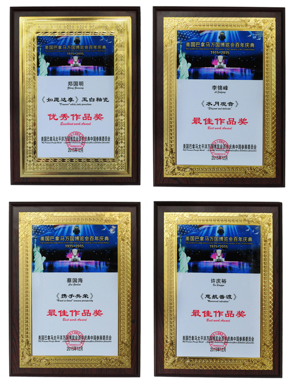 聯(lián)合國文化發(fā)展委員會常務(wù)理事長莫元季先生為獲獎?wù)哳C發(fā)優(yōu)秀作品獎,宜興紫砂產(chǎn)區(qū)代表、景德鎮(zhèn)陶瓷產(chǎn)區(qū)代表、德化陶瓷產(chǎn)區(qū)代表以及中國陶瓷藝術(shù)文化發(fā)展中心代表上臺領(lǐng)獎