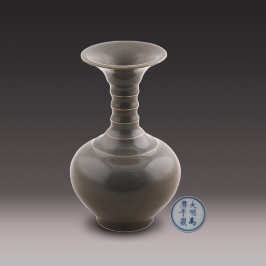 瓶撇口,長(zhǎng)頸,鼓腹,造型優(yōu)美,線條優(yōu)雅,頸部與肩部都以旋紋來裝飾,有層次感。此瓶形制端莊,通體施茶葉末釉,釉面發(fā)色沉穩(wěn),有高雅文士的氣質(zhì),美感獨(dú)特?钭R(shí)是“大明萬歷年制”六個(gè)正楷大字,該藏品具有較高的收藏價(jià)值。