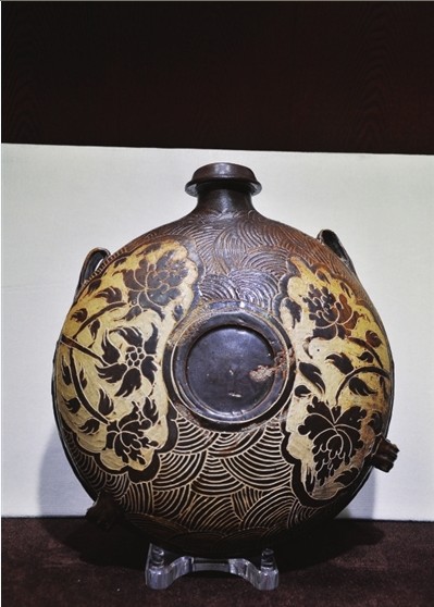 為讓記者全面地觀賞此物,趙志平特將此物固定在展示臺(tái)內(nèi)。該扁壺通體給人以開闊、明朗之感:高35cm,口徑6cm,腹徑33cm,小口,卷沿,短徑,腹部扁平,近口部有左右對稱的耳系;正反兩面中間均有一圈足,腹部圈足起放置平穩(wěn)的作用,正面圈足則起對稱加固胎體的作用;主體飾以圈足左右對稱的兩組牡丹花紋,周圍空間用弧弦刻紋填補(bǔ);施褐釉,腹部不掛釉,灰胎,其剔刻線條流暢,造型質(zhì)樸,構(gòu)圖新穎。