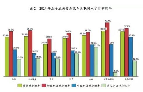 報(bào)告指出,專(zhuān)業(yè)服務(wù)業(yè)、電信業(yè)、電子業(yè)、金融業(yè)、消費(fèi)品制造業(yè)和文化傳媒業(yè)從業(yè)人員是流入互聯(lián)網(wǎng)最多的六大群體,職場(chǎng)新人不僅轉(zhuǎn)行互聯(lián)網(wǎng)的人數(shù)最多,升職空間也最大;高學(xué)歷能夠增加升職優(yōu)勢(shì);行業(yè)資深人士往往以成熟的管理能力和開(kāi)闊的視野在跳槽后獲得升職。