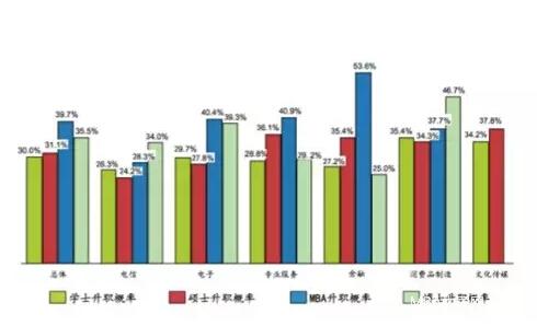 數(shù)據(jù)顯示,在互聯(lián)網(wǎng)行業(yè),學(xué)歷和升職概率呈正比,擁有MBA和博士學(xué)歷的跳槽者晉升機(jī)會(huì)最多,碩士生則比本科生更有晉升優(yōu)勢(shì)。