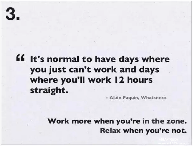 在狀態(tài)時(shí),多干點(diǎn);不然就好好休息:有時(shí)會(huì)連著幾天不在工作狀態(tài),有時(shí)在工作狀態(tài)卻又天天忙活12個(gè)小時(shí),這都很正常。