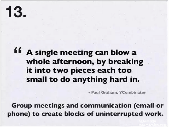 把會(huì)議和溝通 (郵件或電話) 結(jié)合,創(chuàng)造不間斷工作時(shí)間:一個(gè)小會(huì),也會(huì)毀了一個(gè)下午,因?yàn)樗鼤?huì)把下午撕成兩個(gè)較小的時(shí)間段,以至于什么也干不成。