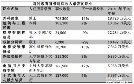 通過《職業(yè)展望手冊》,我們可以看到每種教育背景對應收入最高的職業(yè)是什么。
