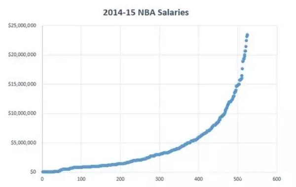 這個世界的財富分配是極端極端極端不均衡的。站在塔頂?shù)娜苏加兄@個世界的大多數(shù)財富。在靠本事吃飯的領(lǐng)域, 這種不均衡也非常明顯。下圖是2014-15賽季NBA球員的薪酬分布(橫軸表示球員的薪酬排名,越往右則排名越高,縱軸就是年薪的金額):
