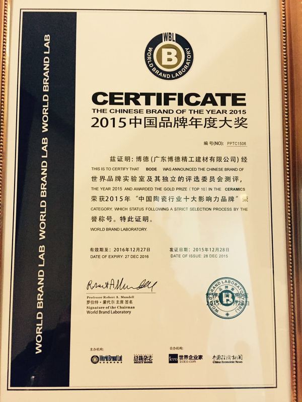 2015年12月28日,由世界品牌實驗室(World Brand Lab)主辦的“中國品牌年度大獎”發(fā)布會在北京隆重舉行,廣東博德精工建材有限公司旗下的高端品牌“博德”榮摘“中國品牌年度大獎——中國陶瓷行業(yè)十大影響力品牌”。哈佛大學(xué)商學(xué)院教授約翰·戴騰博士、耶魯大學(xué)管理學(xué)院教授萊維·多爾博士出席了會議并為獲獎?wù)哳C發(fā)獎牌。