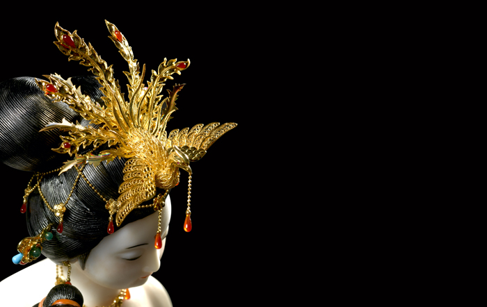 同時,仕女身上的黃金珠寶飾物也在精心打造中。發(fā)釵、手鐲、項鏈、耳環(huán)、紈扇等珠寶首飾,均是花絲為骨,黃金為原料,用掐、填、攢、焊、堆壘等技法編結(jié)成型;再以鑲嵌作飾,用挫、鎪、捶、悶、打、崩、擠、鑲等技法,將金屬片做成托和爪子型凹槽,鑲以寶石。完成后的飾物再一一精心佩戴在瓷雕仕女上,因此都是活動、可拆卸的。