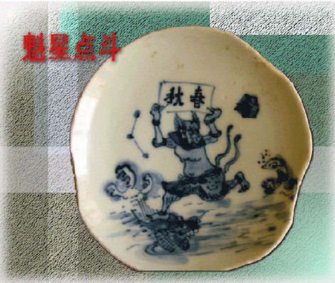 到了明代晚期,“獨占鰲頭”的瓷畫已經(jīng)逐漸和“魁星點斗”結合在一起。在科舉時代,通過參加考試以求仕進,幾乎是讀書人唯一的晉身之階,所以衍生出很多吉祥用語,如“登龍門”、 “獨占鰲頭”,等等,這其中“魁星點斗”的說法,非常流行。民間傳說,魁星原是一位讀書人,連續(xù)三次在科舉考試中取得“連中三元”的佳績,卻都因貌丑而被黜退,他萬念俱灰,投水自盡,感動天神,命大鰲將其救起,升上天庭作了司職人間文運的神祇。