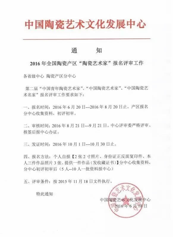 由中國陶瓷藝術(shù)文化發(fā)展中心主辦的第二屆“中國青年陶瓷藝術(shù)家”、“中國陶瓷藝術(shù)家”、“中國陶瓷藝術(shù)名家”評審活動現(xiàn)開始報名,報名截止時間2016年9月18日,本次活動將通過全國報名,由中國陶瓷藝術(shù)文化發(fā)展中心評審委員會評審出一批陶藝家,同時將于2016年10月1日至10月8日在北京全國企業(yè)家聯(lián)盟舉辦獲獎作品展,獲評藝術(shù)家、作品還將通過中華陶瓷網(wǎng)、中國陶瓷藝術(shù)文化發(fā)展中心官網(wǎng)、官方微信平臺上推廣,評獎作品分為日用及工藝陶瓷兩類,有意參加作品評獎、藝術(shù)家評審的可以盡快下載表格提交報名。