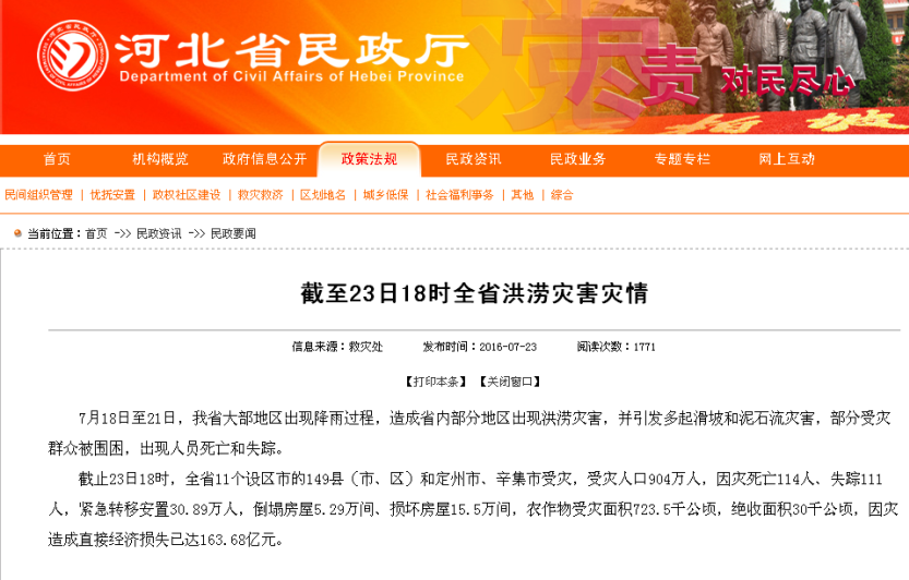 今年7月18日開始,河北遭遇到巨大災難。據(jù)河北省政府官網(wǎng)消息,截止23日18時,全省11個設區(qū)市的149縣(市、區(qū))和定州市、辛集市受災,受災人口904萬人,因災死亡114人、失蹤111人,緊急轉(zhuǎn)移安置30.89萬人,倒塌房屋5.29萬間、損壞房屋15.5萬間,農(nóng)作物受災面積723.5千公頃,絕收面積30千公頃,因災造成直接經(jīng)濟損失已達163.68億元。