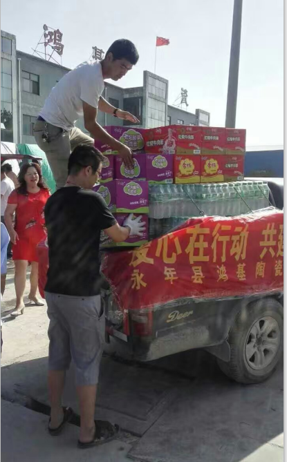天災無情,人間有愛。位于河北省永年縣的河北鴻基陶瓷有限公司董事長黃國汀、夏惠鳳、董行樹等公司高層對這次受災高度重視,每天派人在各區(qū)和村及時的不停給當?shù)貫拿袼蜏嘏,把大米、油、方便面、火腿腸、消毒液等急需物質(zhì)及時送到災民身邊。