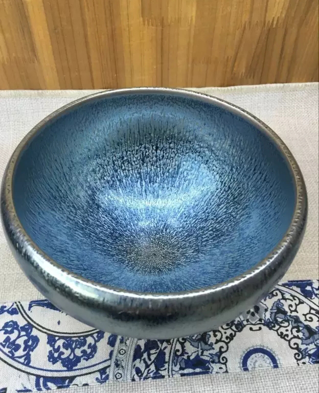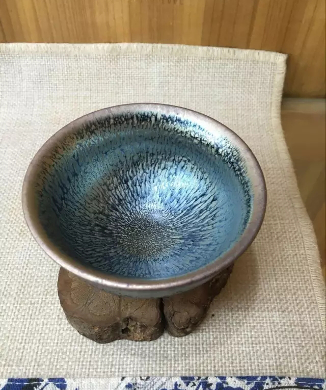 “柴燒天目盞”真是入窯一色,出窯萬(wàn)彩,燦若星辰,變幻莫測(cè),這些色彩斑斕的瓷器,其原料取自天然的富含鐵礦物質(zhì),經(jīng)科學(xué)的配方,采用木柴去燃燒的原始方法燒制。其特殊的燒成工藝,從而形成窯變的效果,具有獨(dú)特的金屬顏色和紋理,坯胎呈藍(lán)泛黑,而釉面呈七彩光澤,并有放射狀結(jié)晶體,如同夜空的繁星,給人以返璞歸真的美感,還具有軟化水質(zhì)的作用,長(zhǎng)期使用柴燒天目盞,有延年益壽的功效,成為現(xiàn)實(shí)生活實(shí)用、收藏和鑒賞的陶藝新貴。