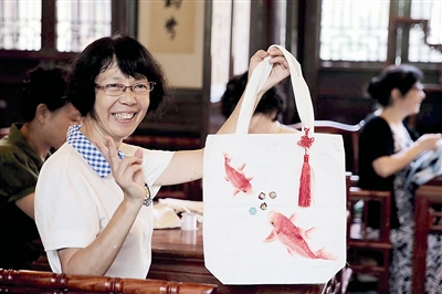 “雙魚戲珠”“鳥語花香”“鯉魚躍龍門”……學(xué)員們發(fā)揮著自己的想象,一針一線,在環(huán)保袋上任意穿梭。原本普通的袋子煥發(fā)了新生命,變得精致靈動(dòng),形成一幅幅生動(dòng)的畫面。