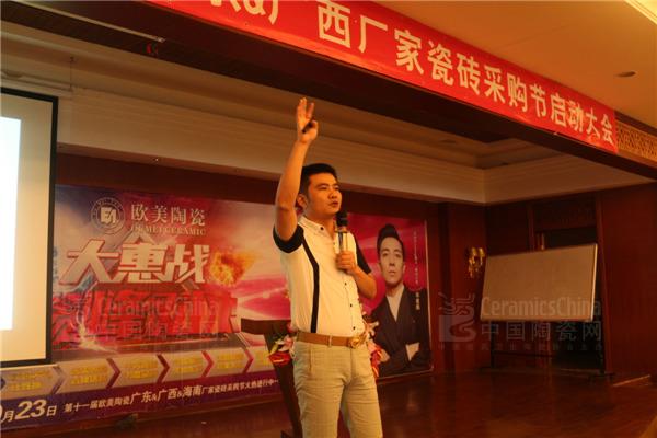 會(huì)議開始,由歐美陶瓷廣東區(qū)大區(qū)經(jīng)理?xiàng)钪逻h(yuǎn)作致辭并闡述了誓師大會(huì)的目的、宗旨和愿景。楊總表示,歐美陶瓷第十一屆廣東&廣西&海南廠家瓷磚采購(gòu)節(jié)不僅僅是一場(chǎng)聯(lián)動(dòng)團(tuán)購(gòu)項(xiàng)目,更是一座意義深遠(yuǎn)的品牌發(fā)展里程碑,他希望能通過(guò)積極的營(yíng)銷探索為品牌升級(jí)作出更多的努力嘗試,能讓歐美陶瓷及經(jīng)銷商團(tuán)隊(duì)注入鮮活血液,帶來(lái)無(wú)窮的力量。他信心百倍地表示,歐美陶瓷腳踏實(shí)地專注瓷磚發(fā)展,憑借著百折不撓的精神+100%的意愿+100%的努力,在本場(chǎng)三省聯(lián)動(dòng)大型團(tuán)購(gòu)活動(dòng)中一定可以打一場(chǎng)漂亮的戰(zhàn)役,一戰(zhàn)“驚”人!