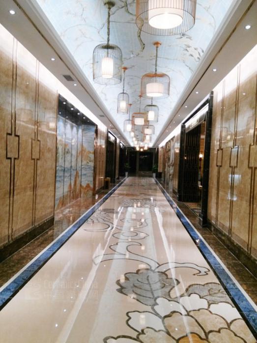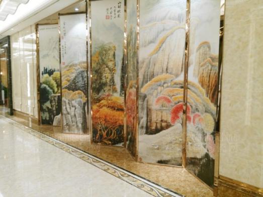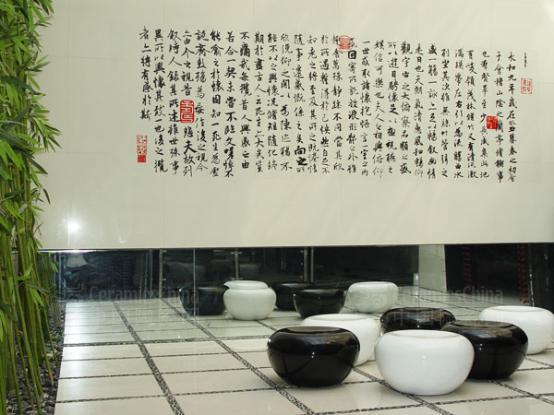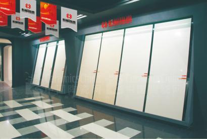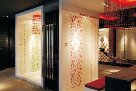 新展廳大量運(yùn)用了中國山水瓷藝畫、中式屏風(fēng)、青銅鳥籠燈、不銹鋼窗格等元素來展示瓷磚的藝術(shù)殿堂。走進(jìn)面積達(dá)250平方的中空大堂,左右兩邊的中國山水瓷藝畫相互輝映,加上不銹鋼窗格在旁點(diǎn)綴裝飾,整個大堂格調(diào)高雅,氣勢蓬勃。