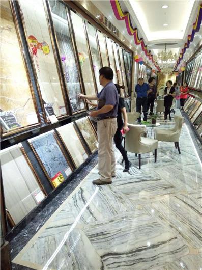 銷售人員向業(yè)主們展示意利寶陶瓷優(yōu)越的瓷磚物料性能