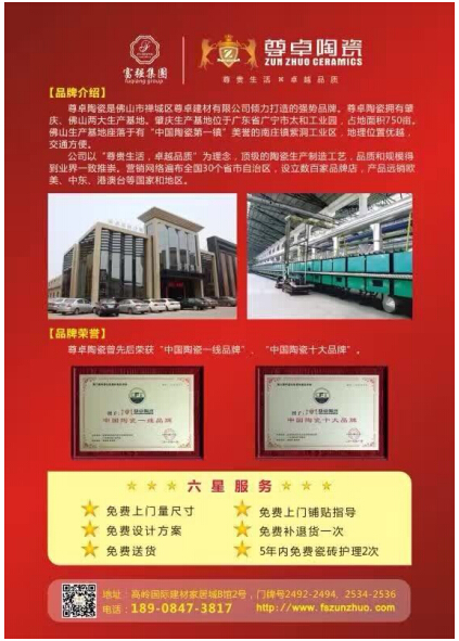經(jīng)典不可替代,成為家居世界的傳奇,尊卓陶瓷擁有卓越的六大優(yōu)勢(shì)功效,完全采用新型的技術(shù)革新,綠色環(huán)保無(wú)輻射,一石三面的金剛釉技術(shù)使用,大理石高度的逼真效果讓裝修風(fēng)格更加高大上。高硬度、高耐磨和高效抗污的絕佳作用讓選擇尊卓陶瓷的人群尊享品質(zhì)生活。