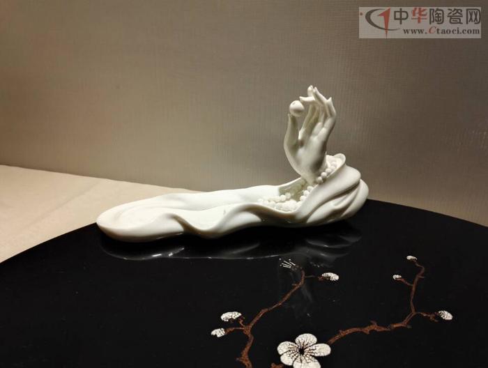 許氐第六代傳人許瑞卿作品,采用德化優(yōu)質(zhì)高嶺土,瓷質(zhì)潔白,溫潤如玉。衣袖飄逸自然成托,佛手捻珠以為香插,極富禪意。