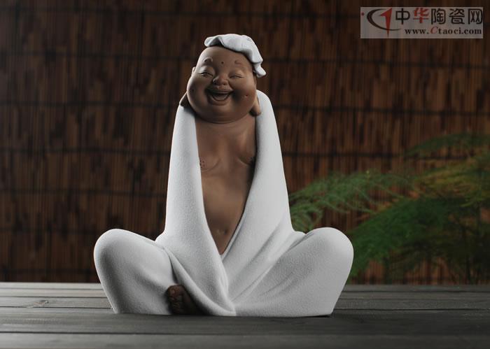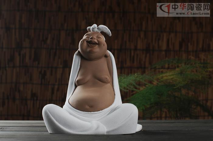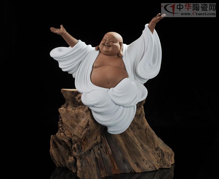 當(dāng)代德化實(shí)力派陶藝家鄭志德作品,小彌勒坦胸露腹,笑容可掬,巧妙地應(yīng)用紫砂泥作為膚色,喜鵲飛上眉梢,寓意“喜上眉梢”。