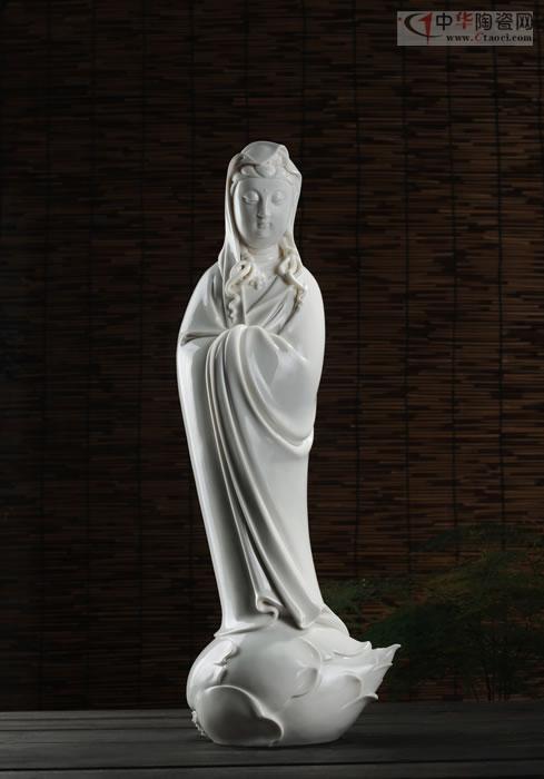 觀音立于蓮花之上,衣紋線條流暢飄逸,雙目微閉,神情安詳,形象傳神。作品精雕巧塑,風(fēng)格獨(dú)特,經(jīng)1300多度高溫?zé),瓷質(zhì)潔白,純凈溫潤(rùn),猶如脂玉。