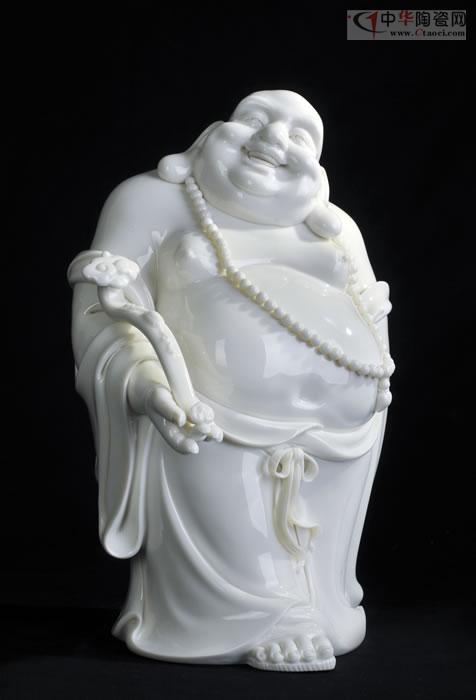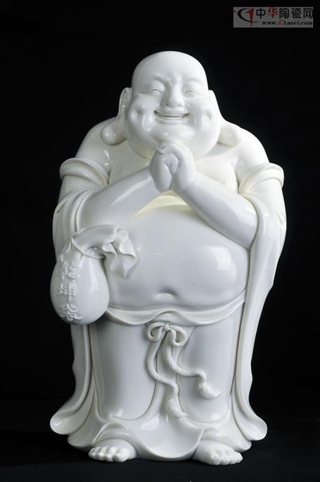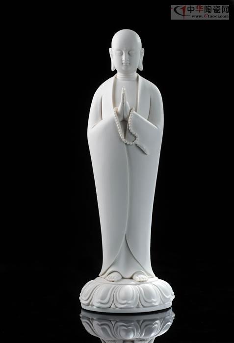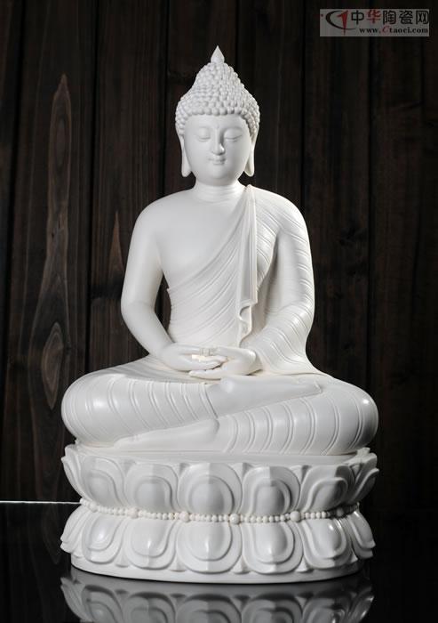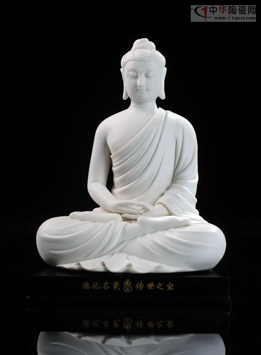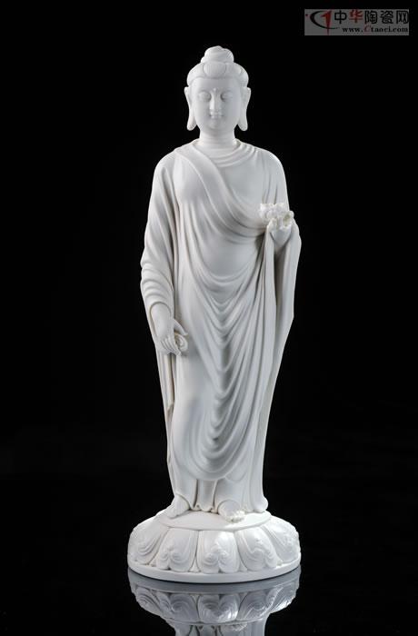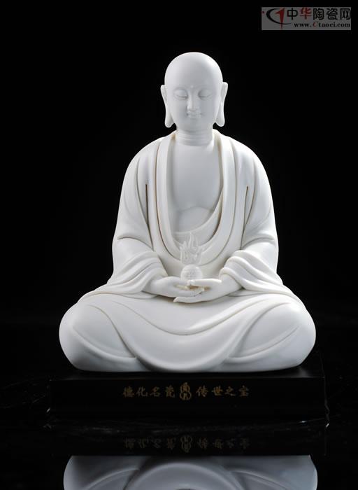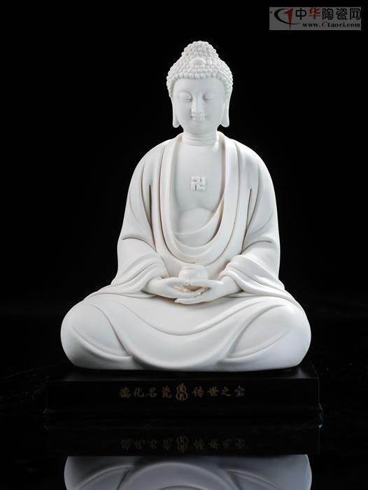 如來(lái)雙手托缽,面形豐滿圓潤(rùn),眉如彎弓,雙目俯視,神態(tài)沉靜內(nèi)省,作品潔白堅(jiān)硬、色澤瑩潤(rùn)、胎體滑潤(rùn)致密。釉面晶瑩光亮,是中國(guó)白德化白瓷器之尚品,東方之珍品瓷。