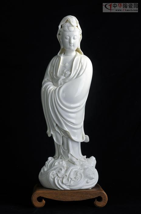 林建平最具代表作品,以德化白瓷為胎質(zhì),圓勁有力如凝脂似玉,滋潤(rùn)瑩滑。線條清晰、簡(jiǎn)潔、瀟灑,多變化,柔媚流暢,翻轉(zhuǎn)自然,觀音雙手藏袖,露一足踏蓮花,另一足水花掩蓋,作踏浪凌波渡海之勢(shì)。神情嫻雅平靜,安詳自若,雙目低垂凝思。整座塑像精巧細(xì)致,神態(tài)如生。該作品2013年被永久收藏于福建省非物質(zhì)文化遺產(chǎn)博覽苑。手刻簽名,極具收藏價(jià)值。
