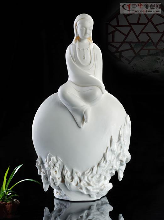 作品《渡海觀音》以德化白瓷為胎質(zhì),圓勁有力如凝脂似玉,滋潤(rùn)瑩滑。線條清晰、簡(jiǎn)潔、瀟灑,多變化,柔媚流暢,翻轉(zhuǎn)自然,觀音雙手藏袖,露一足踏蓮花,另一足水花掩蓋,作踏浪凌波渡 海之勢(shì)。神情嫻雅平靜,安詳自若,雙目低垂凝思。整座塑像精巧細(xì)致,神態(tài)如生。該作品2013年被永久收藏于福建省非物質(zhì)文化遺產(chǎn)博覽苑。