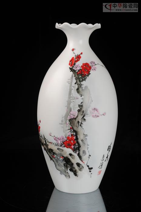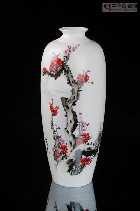 作品胎體采用德化上等玉瓷制成,瓷泥一噸達(dá)數(shù)萬元,瓷質(zhì)溫潤,細(xì)膩。作品畫工精致,所繪梅花干蒼枝勁,花朵疏落有致,格調(diào)清新,頗具意境。瓶體圓潤光滑,口部形似荷葉,瓶身線條流暢,顯得豐滿俊秀。以梅開五福入畫,色澤溫潤柔美,具有典雅秀麗的藝術(shù)風(fēng)格。
