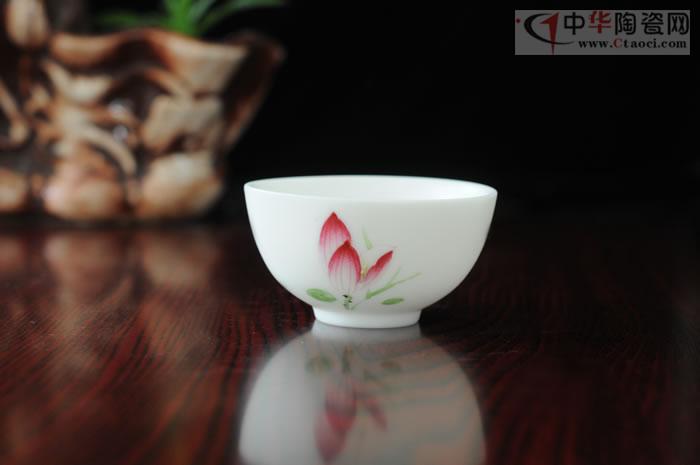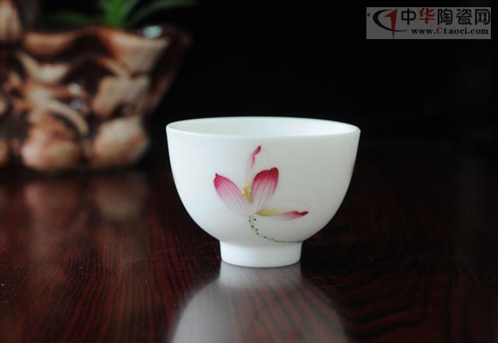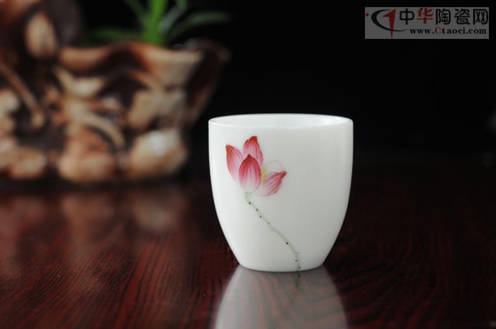 作品采用特級德化白瓷高嶺土,3萬/噸。手工玉瓷杯,珠圓玉潤,執(zhí)杯在手,光潤潔白,如脂似玉,手感極佳,令人愛不釋手,作品胎骨潔白,堅實致密,有凝脂似玉之感,迎光透視,色澤光潤明亮,晶瑩剔透,杯身手繪荷花,清新淡雅,集實用性、觀賞性、收藏性于一體,是品茗佳選。