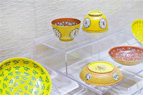 展覽現(xiàn)場(chǎng),有一套館藏“鎮(zhèn)館之寶”——同治皇帝大婚瓷。記者看到,這套同治大婚瓷共分碗、盤(pán)、碟、酒盅、羹匙等24種器形,淡黃的色底上配有藍(lán)、綠、粉色的紋飾,其燒造工藝十分考究。每件瓷器的款識(shí)一律用紅彩楷體書(shū)寫(xiě),有“同治年制”和“燕禧同和”兩種款式。