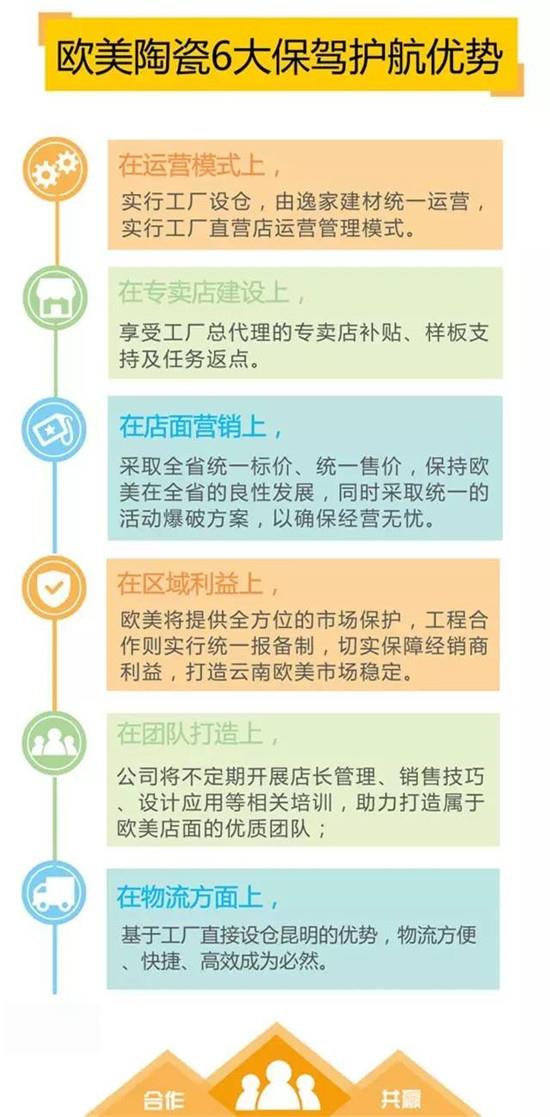 歐美陶瓷云南分公司為了能更好地開拓云南當地的市場,將于2016年11月8日召開“新模式 新平臺 新未來”主題招商會暨昆明營銷中心開業(yè)儀式。在11月8日舉辦的云南地區(qū)招商會上,歐美陶瓷也會給予經銷商們非常利好的政策,同時,成為歐美陶瓷云南分公司的經銷商,將享有平臺保駕、政策護航的明顯優(yōu)勢。