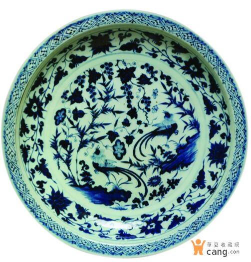V·A博物館六樓瓷器展廳,玻璃柜內(nèi)赫然擺放著一坨海撈瓷殘片(圖1),應(yīng)屬于我國(guó)明代輸出的青花瓷盤(pán),別稱(chēng)為克拉克瓷。明代早期,瓷器的大量輸出與鄭和八次遠(yuǎn)航有密切關(guān)系。瓷器輸出的另一方式是“入貢”國(guó)家使節(jié),回國(guó)時(shí)帶回的。對(duì)中國(guó)精美的瓷器,世界各國(guó)人士愛(ài)不釋手,尤其是青花瓷器,幾乎遍及亞、非、歐、美各洲。當(dāng)然中國(guó)的制瓷業(yè)也從國(guó)外獲得物質(zhì)、技術(shù)和藝術(shù)上的借鑒與幫助。習(xí)近平主席今年1月21日在《伊朗報(bào)》發(fā)表《開(kāi)創(chuàng)中伊關(guān)系美好未來(lái)》一文中指出:“來(lái)自伊朗的蘇麻離青和中國(guó)的高超工藝結(jié)合,成就了青花瓷的雅致。”元青花瓷器應(yīng)當(dāng)是V·A博物館陶瓷展廳展示的強(qiáng)項(xiàng),元青花展品總計(jì)有七件之多,品種包括龍紋皿系扁壺、牡丹紋八棱大罐、海水紋花口大盤(pán)、鴛鴦戲水滿池嬌花口盤(pán)、青花雉雞竹石花果紋盤(pán)(圖2)等典型標(biāo)準(zhǔn)器。