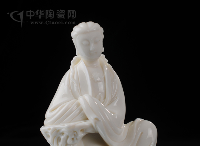 走進(jìn)李建水的工作室,一尊坐巖觀(guān)音非常引人注目,它在自然光照中晶瑩剔透,如脂似玉,而且沉穩(wěn)厚重。她僅37cm高,竟有7100克重。顯然,這是一尊十分珍稀又神奇的瓷塑妙相觀(guān)音。