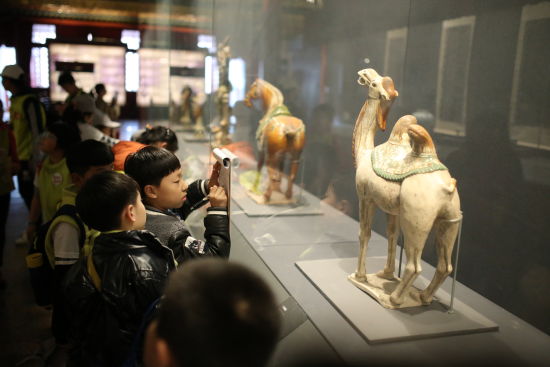 在陶瓷館內,解說員告訴孩子們關于陶瓷的各種小知識,例如陶和瓷有何不同,被譽為“瓷母”的各色釉大瓶有何獨特之處,“唐三彩”是給逝者使用的冥器等等。在參觀完多個展品后,孩子們分為男生女生兩組,比賽用最短時間拼好“唐三彩”及“瓷母”兩幅拼圖。