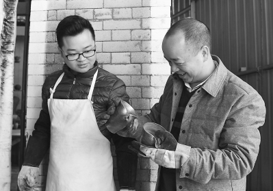 開窯是每個(gè)手藝人最忐忑的時(shí)刻,蘇記茶陶的蘇天培(右)對自己的作品很滿意。