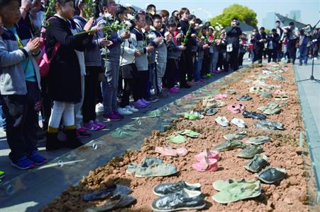 清明節(jié),除了緬懷逝去的祖先和親人,我們不應(yīng)忘了在1937年那場戰(zhàn)爭中遇難的30萬同胞。4月3日上午10時,侵華日軍南京大屠殺遇難同胞紀(jì)念館雕塑廣場上,陳列著80雙象征著被殺戮同胞的陶瓷鞋,用這種特殊的方式悼念在80年前那場慘案中遇難的同胞。