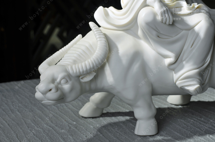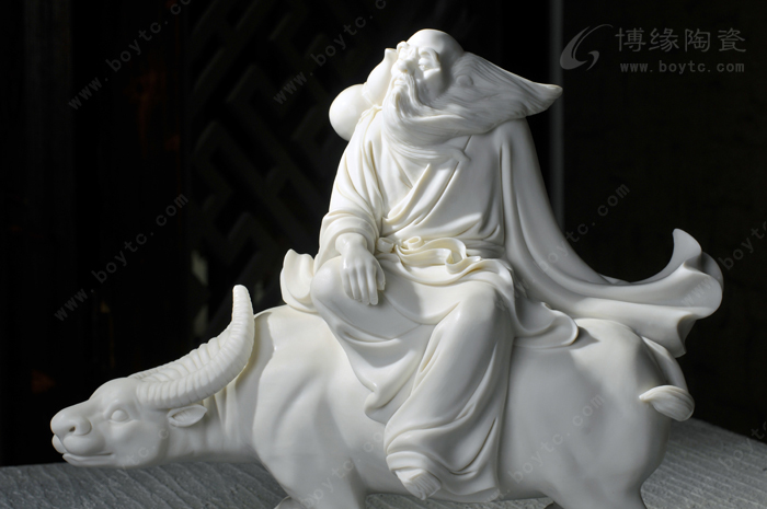 老子有兩道長長的白眉毛,宛若兩道白色瀑布,順著陡峭的臉頰,夸張地飄落;而那長長的白胡須,被風(fēng)往前吹著,好像探路的觸角,指向了西方