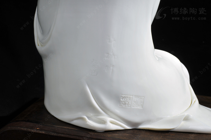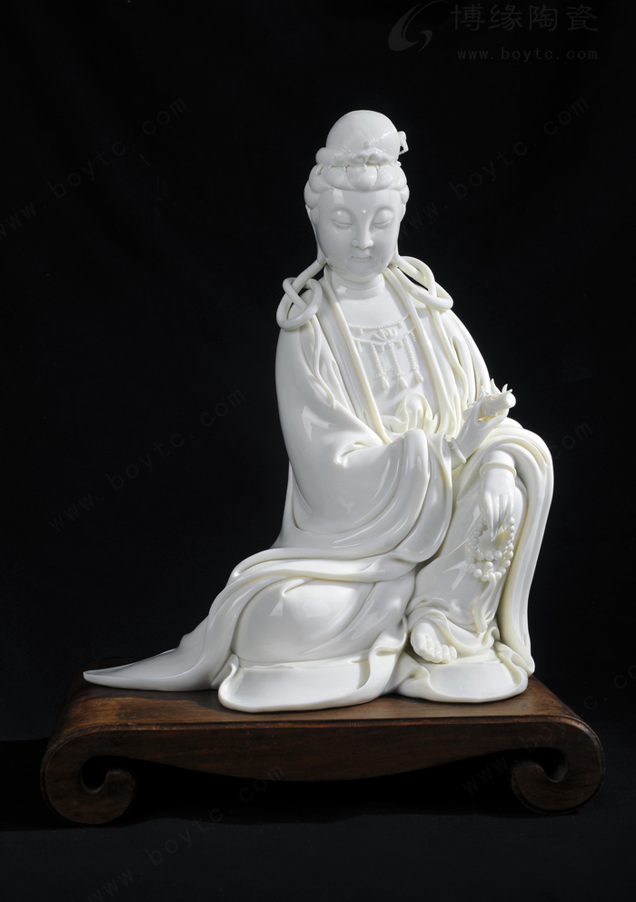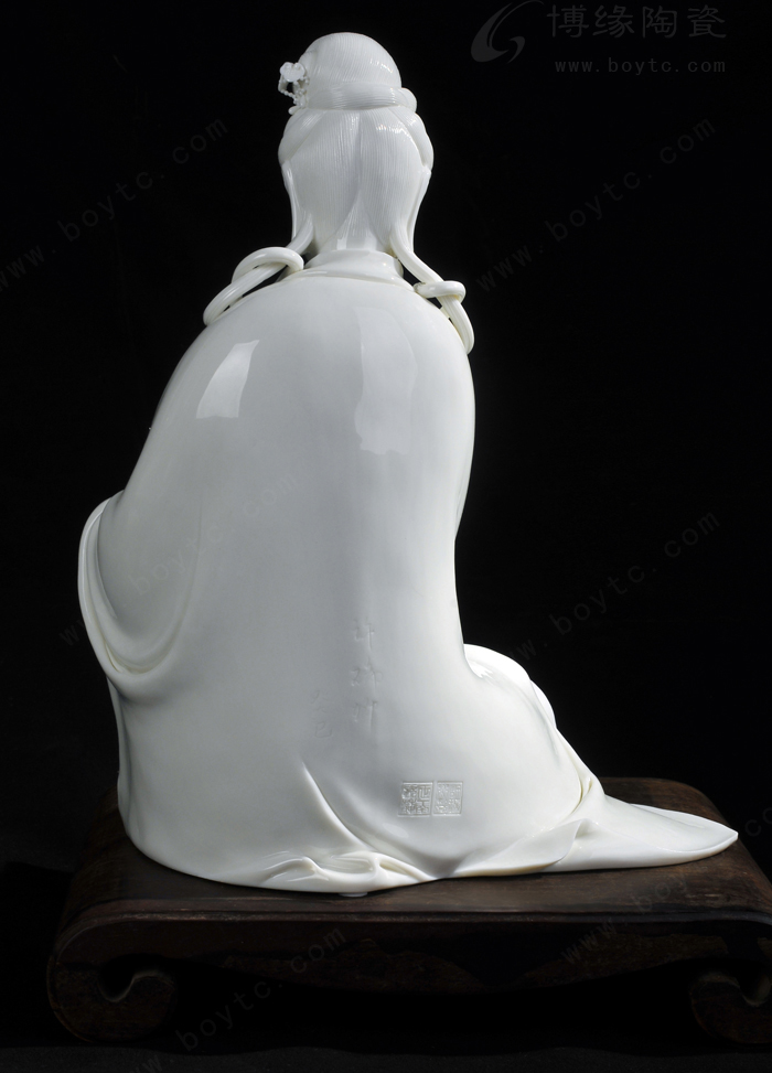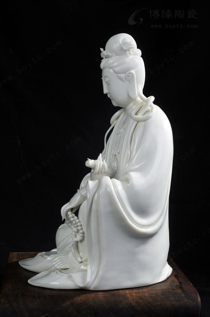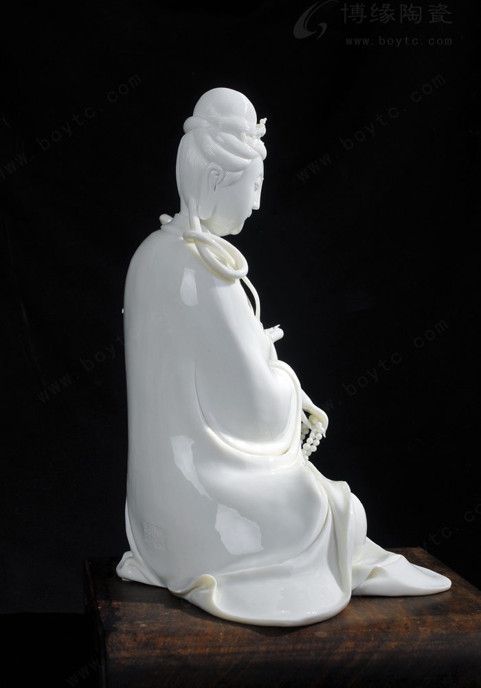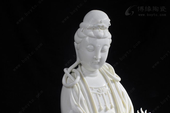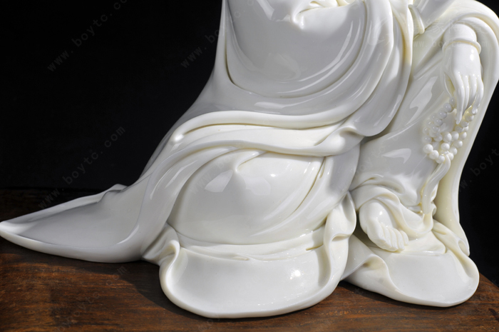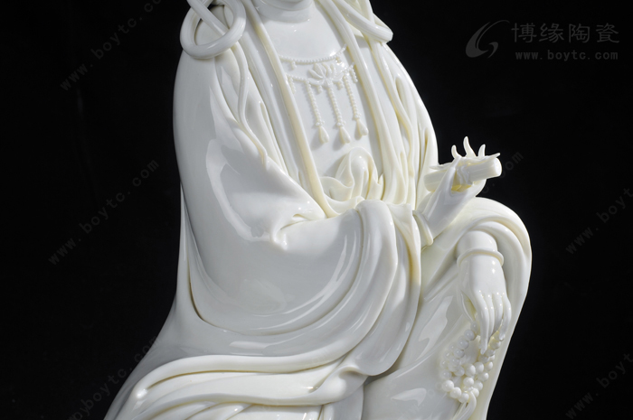 《持經(jīng)觀音》以德化特有的溫潤如玉的“中國白”為胎質(zhì),純手工制作,所塑人物性格鮮明,造型優(yōu)美,神態(tài)逼真,風格洗練。