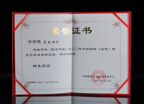 2016年作品《傲雪寒梅》在2016中國際(北京)陶瓷藝術(shù)名家精品展,被評為為金獎